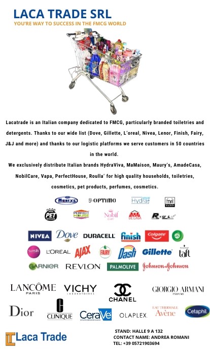 Lacatrade is dedicated to FMCG,branded toiletries, detergents, households and pet lines. We have Dove, Gillette, L’oreal, Nivea, Lenor, Finish, Fairy, J&J and much more. We have customers in over then 50 countries in the world. We exclusively distribute Italian brands HydraViva, MaMaison, Maury’s, AmadeCasa, NobilCare, Vapa, PerfectHouse, Roulla’, Optimo, Pet vogue, for high quality households, toiletries, cosmetics, pet products.