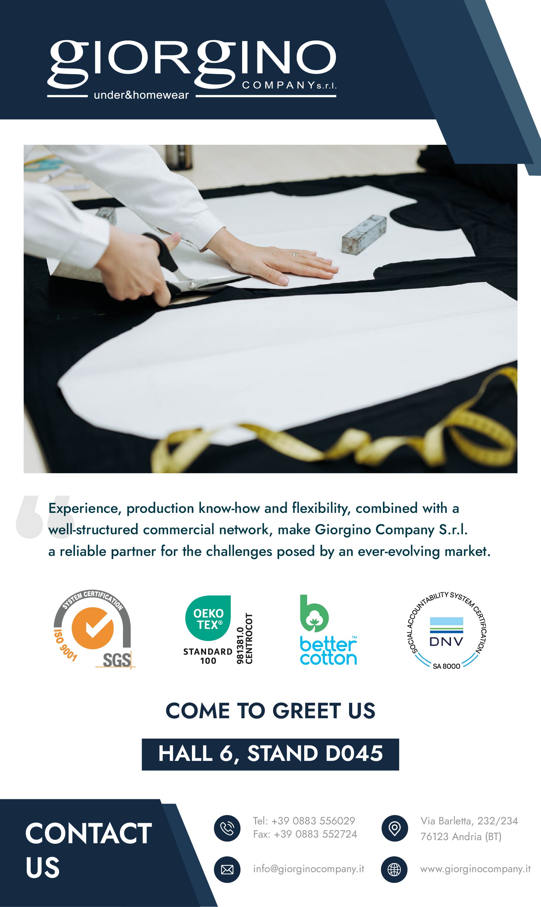 Giorgino Company S.r.l.,boasts over forty years of consolidated experience in the textile sector, having specialized in the production of underwear, nightwear, and homewear. With a wide variety of products for men, women, and children, it targets the mid-range market segment.Giorgino Company s.r.l. primarily targets the world of GDO, DO,Discount, with the production of both its own brands.Our Certifications: ISO9001:2015-OEKOTEX-BCI-SA8000.