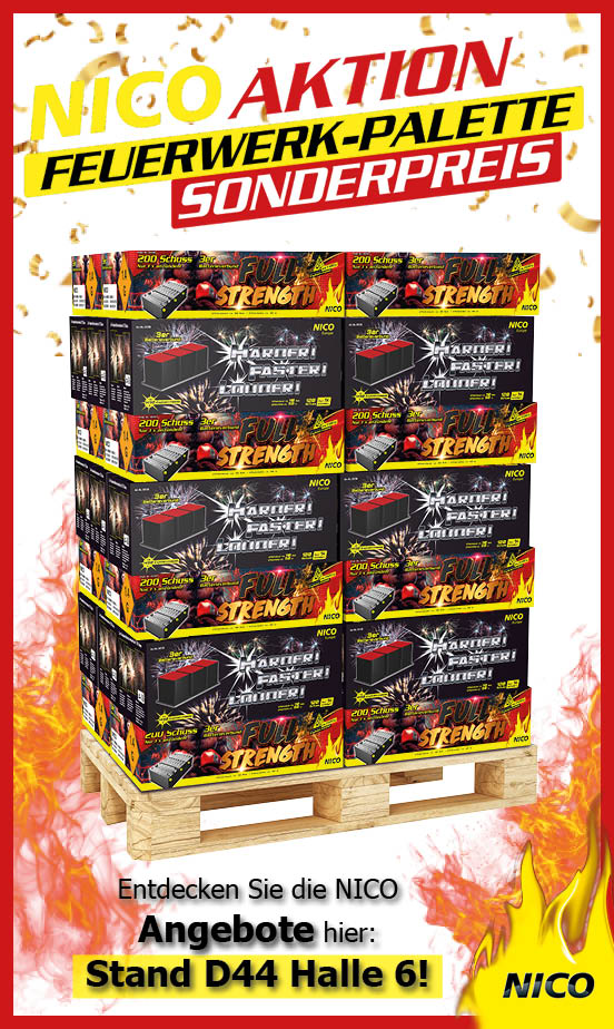Feuerwerk & Partyartikel, die im Handel zünden! Seit mehr als 75 Jahren gehören wir zu den führenden Pyrotechnik-Anbietern in Deutschland. Entdecken Sie Silvester-Highlights, Ganzjahresfeuerwerk und Partyartikel – plus neue Batterien, Fontänen und weitere grandiose Neuheiten 2026. Nur bei der IAW und nur bei NICO: Exklusive Messeangebote und Top-Seller vor Ort!